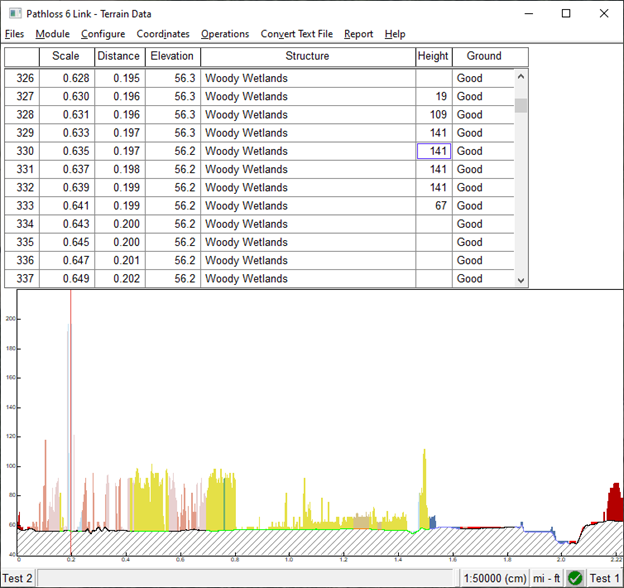 toolbar button will generate a terrain background using the clutter data configured for Clutter 2. Following the setup described above, this will correspond to the USGS 1-meter LiDAR data. The example below shows a profile crossing a power transmission line.
