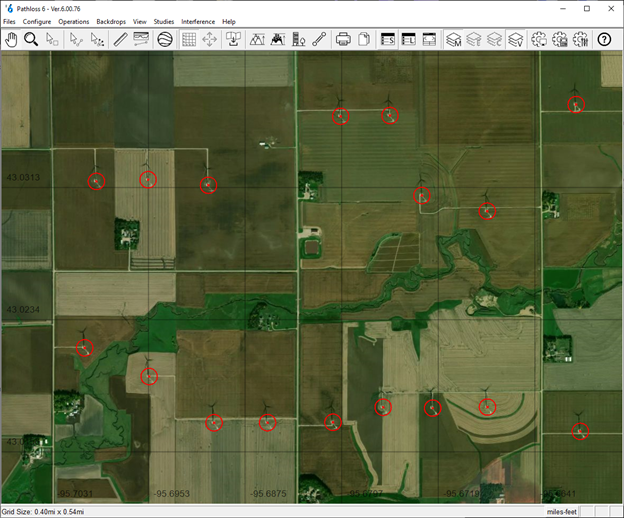 This file can then be added to the Vector File Index in the GIS Setup Dialog. Pathloss will display the wind turbine locations and their radius in the network window.