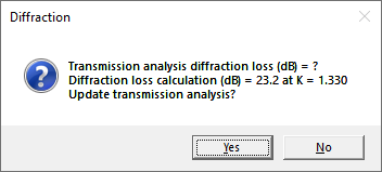 The diffraction loss is NOT automatically transferred to the Transmission Analysis module. Many operations are carried out in the diffraction section which are not applicable to the transmission path. These include the calculation of diffraction loss as a function of the earth radius factor (K) and analysing the loss from a reflection point to an antenna. If the Transmission Analysis diffraction loss entry is different than the current diffraction loss calculation, you will be prompted to use the calculated value.