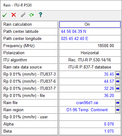 All of the ITU-R P530 rain options set under Configure - Options - Calculation Options - Rain... are duplicated in this data entry form.