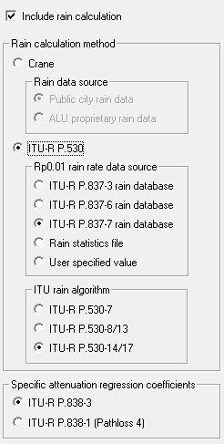 Rain calculations can be made using the Crane or ITU-530 algorithms. The choice is made under Configure - Options - Calculation Options - Transmission calculations - Rain.